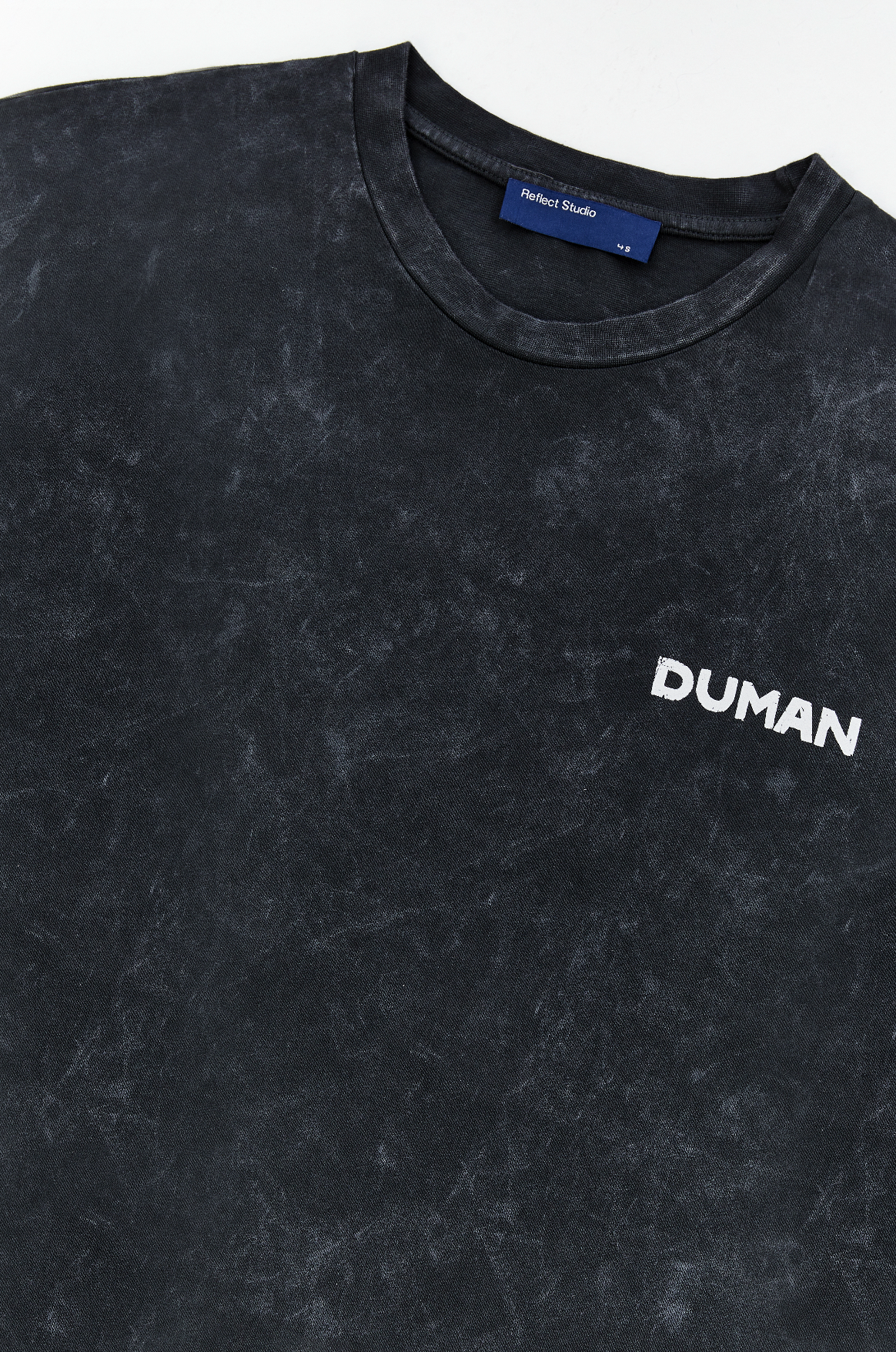 %100 pamuk premium yıkanmış kumaş, 200 GSM heavyweight, antrasit siyah renk, ön-arka baskılı, özel kalıp oversized t-shirt.